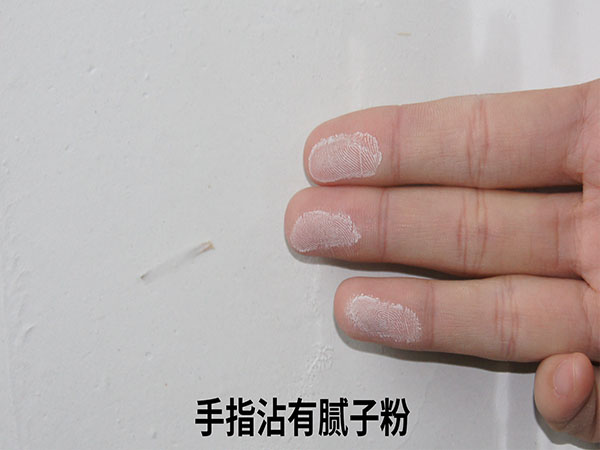 劣質膩子粉:用手指輕輕地擦過涂有劣質的膩子粉的樣板表面,手指上面沾有許多膩子粉。